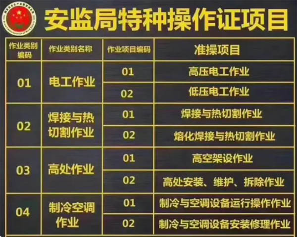 應(yīng)急管理部特種作業(yè)操作證包含工種及作業(yè)范圍
